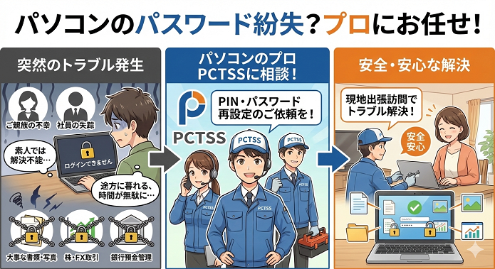 ご親族の突然のご不幸や社員の失踪などで大事な書類や写真を保存していたパソコン、株やFXなどの取引または銀行の預金などを管理していたパソコンなどのパスワードが分からなくなってしまった、ログイン出来なくなった場合、 素人では解決出来ません。 どうすれば良いか、誰に相談すれば良いかも分からずに途方に暮れてしまい、貴重なお時間を何時間も無駄に費やしてしまうかと思いますが、そのような場合は我々プロにPINパスワード再設定のご依頼をされては如何でしょうか? 弊社では安全安心、現地まで出張訪問してPINパスワードのトラブルを解決いたします。