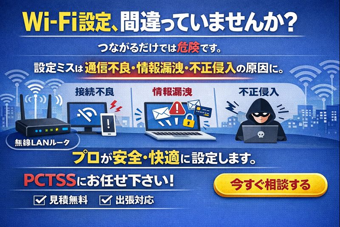 ■通信内容が漏洩する 善意・悪意に関わらず第三者が電波を傍受してしまい、無線LAN経由でIDやパスワード、クレジットカード番号や個人情報、メールなどの通信内容までもが漏洩してしまう可能性があります。 ■悪意のある第三者に不正に侵入され被害を受ける 悪意のある第三者から、個人や会社内のネットワークへアクセス(ハッキング)され、 @銀行の暗証番号や個人情報、機密文書、プライベートな動画像などを盗み出され、悪用される Aお客様のパソコンを踏み台にして通信し、ネット上に不正な情報を流される B傍受した通信内容を書き換えられて(改ざんされて)発信されたり、コンピューターウイルスなどを流され、他人のデータやシステムを破壊する迷惑行為等が行われるなどの可能性があります。 (実際、我々パソコンのプロはセキュリティが甘いPCのハッキングはやろうと思えば容易く出来てしまいます。) これらの問題を発生させないためには必ずPCその物のセキュリティは勿論ですが、無線LANにもセキュリティを掛けておく必要があります。 (実際、セキュリティの選び方が間違っているお客様も沢山おります!) 弊社のパソコン出張サポートスタッフは無線LANを設定するにあたって適切な設定と通信の暗号化をしますので、これらのような問題を発生させることなく、セキュリティも万全で安全安心となります。 ※AOSS、WPS、WEP、WPA/WPA2-PSK(T-KIP/AES)など全ての暗号化に対応可能。 その他ネットワーク構成であったり、電波環境や機器同士の相性なども考えて適切に設定しなければ発生しうる問題も多々あります。 場合によっては無線中継器やメッシュWiFiを導入しなければ宅内全てのお部屋を同一ネットワークの無線LAN環境にするのは不可能だといった物理的な問題の場合もあります。 お客様ご自身で無線LANの設定を何度試みてもインターネットが繋がらず、お時間を無駄にしてしまうより、設定は我々パソコンのプロにお任せ下さい。 まずは一度、診断やコンサルティングだけで呼んで戴いても喜んでお伺い致します。 料金も格安で設定サービスを提供させて戴いておりますので是非一度お問い合わせ下さい! パソコンの他、無線プリンタ、プレステ5(PS5)、任天堂Wii、任天堂DS、iPhoneやAndroidスマートフォン、iPadやタブレットPC、テレビやHD/DVD機器などのデジタル家電の無線LAN(Wi-Fi)設定も対応可能です。今や通信機器はワイヤレス時代(無線LANの時代)、Netflix (ネットフリックス) やAmazonプライムで映画やアニメを楽しみたい方も、この機会に是非とも合わせてご検討下さいませ! お客様に「やっぱり来て貰って良かった!」と喜んで戴きたい、「少しでもお客様のお役に立ちたい!」とスタッフ一同、日々精進しながらお待ちしております。 出張サポートのお問い合わせ、ご依頼は下記一覧からお住まいの地域を選んでクリックして下さい。 お見積もり無料ですので、どうぞお気軽にお問い合わせ下さいませ! |